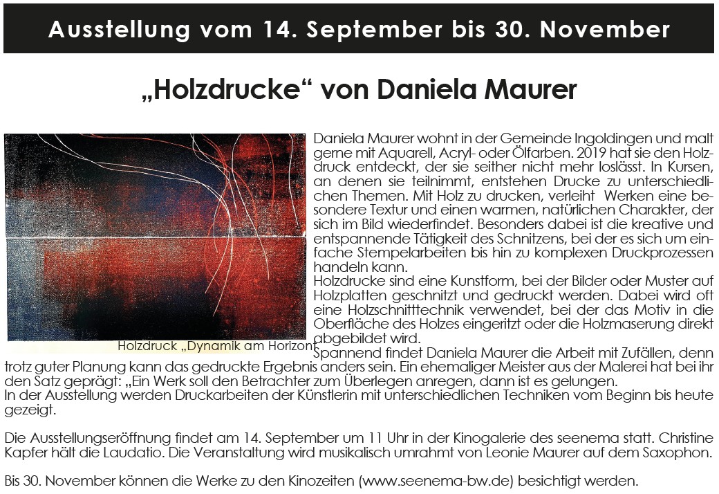 Die Ausstellung wird- sofern es die Pandemiesituation erlaubt -, ab Sonntag, 11. April, im Stadtkino Seenema, Bad Waldsee, Biberacher Straße 29 zu sehen sein. Die Künstlerin ist anwesend. Genaueres wird zeitnah in der Tagespresse und hier veröffentlicht. Die Ausstellung dauert bis zum 11. Juli und ist – je nach Corona-Entwicklung – nach Anmeldung oder zu den Kinozeiten geöffnet.